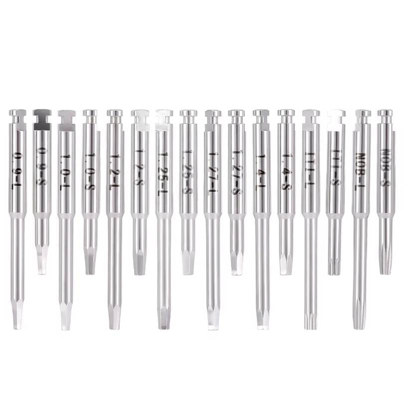It comes equipped with a complete kit of 16 drivers (short and long). This feature makes it compatible with the vast majority of implant systems on the market (such as 0.9, 1.2, 1.25, IT, etc.)
