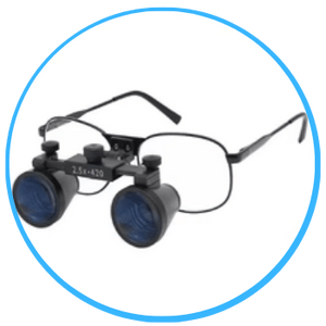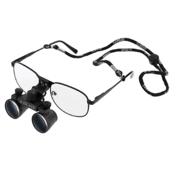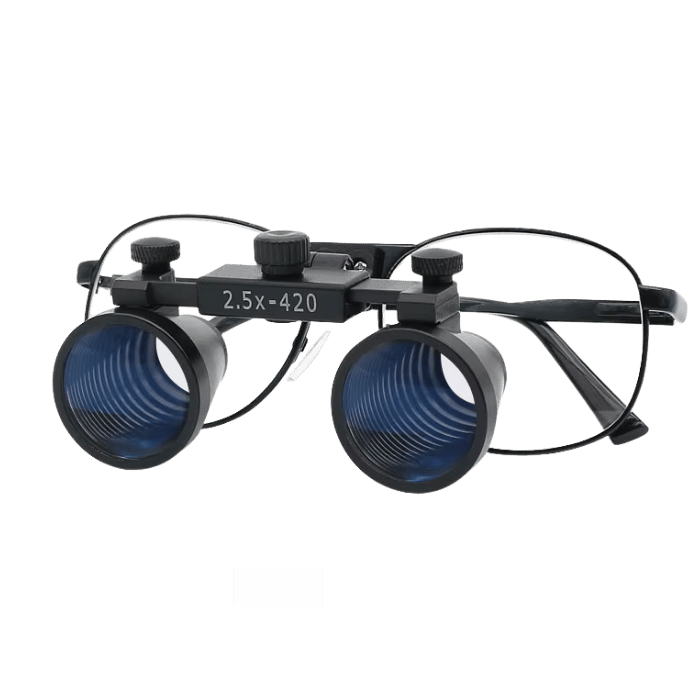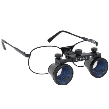Glass lenses with 2.5x or 3.5x magnification and focal length of 30 to 42 centimeters.
